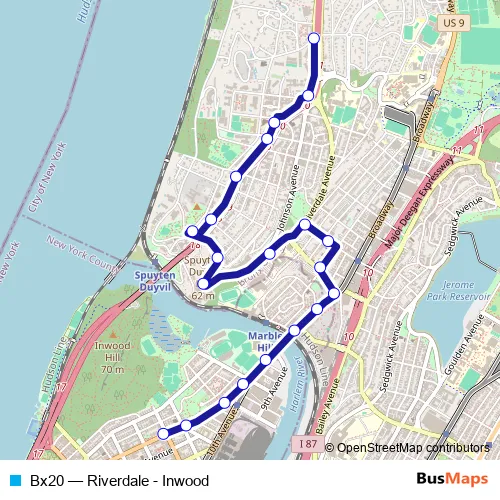 The first stop of the Bx20 bus route is Henry Hudson Pkwy West/W 246 St and the last stop is Broadway/W 207 St. Bx20 (Riverdale - Inwood) is operational during on weekdays.