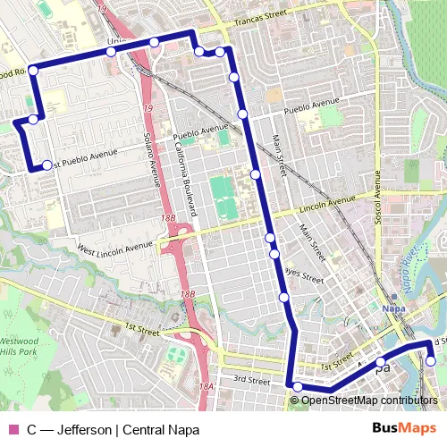 The first stop of the C bus route is Pueblo Ave at Linda Vista Ave and the last stop is Soscol Gateway Transit Ctr. C (Jefferson | Central Napa) is operational during everyday.