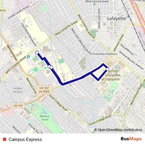 The first stop of the Campus Express bus route is Cajun Field and the last stop is Cajun Field. Campus Express is operational during on weekdays.