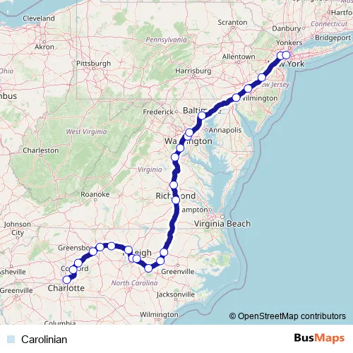 The first stop of the Carolinian rail route is Charlotte Amtrak Station and the last stop is Ny Moynihan Train Hall At Penn Station. Carolinian is operational during everyday.