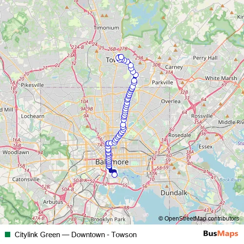 Fairmount Avenue - East Joppa Road - Goucher Boulevard - Taylor Avenue - Loch Raven Boulevard - Meridene Drive - Loch Raven Boulevard - Marble Hall Road - Havenwood Road - Loch Raven Boulevard - The Alameda - Kirk Avenue - East North Avenue - Saint Paul Street - East Madison Street - East Mulberry Street - Saint Paul Place - East Lexington Street - Saint Paul Street - East Redwood Street - East Pratt Street - South Charles Street
