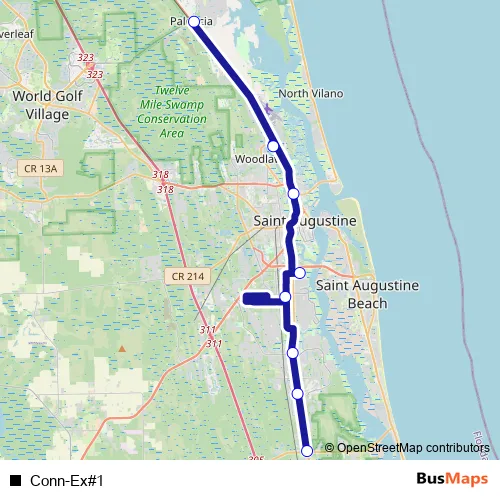 See why over 2 million users trust and consider busmaps.com as the best public transport website. busmaps gives you Saint Augustine Buses suggested routes, real-time bus tracker, line route maps in Saint Augustine, and helps to find the closest Conn-Ex#1 bus stops near you. No internet available? Download an offline PDF map and bus schedule for the Conn-Ex#1 bus to take on your trip.