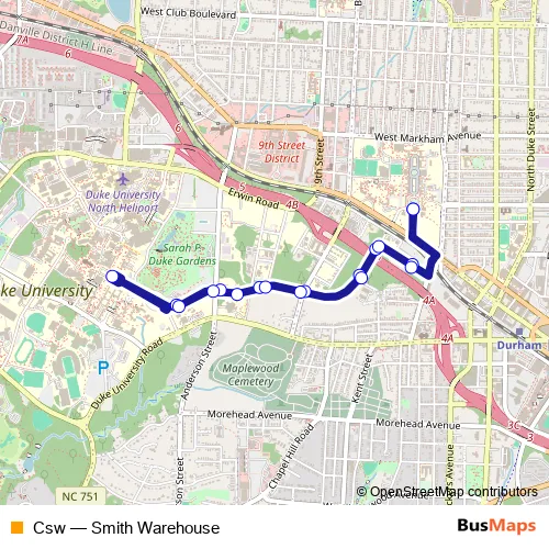 The first stop of the Csw bus route is East Campus (Washington Duke Statue) and the last stop is East Campus (Washington Duke Statue). Csw (Smith Warehouse) is operational during on weekdays.