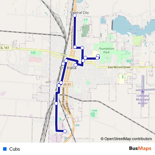 The first stop of the Cubs bus route is Kaskaskia Workshop (Centralia) and the last stop is Citgo Station (Central City). Cubs is operational during on weekdays.