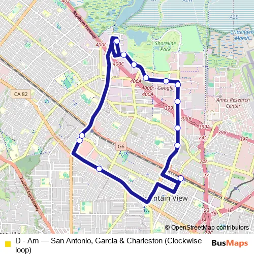 The first stop of the D - Am bus route is Mountain View Transit Center and the last stop is Mountain View Transit Center. D - Am (San Antonio, Garcia & Charleston (Clockwise loop)) is operational during on weekdays.