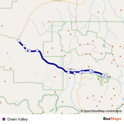 The first stop of the Down Valley bus route is Telluride Court House and the last stop is Placerville. Down Valley is operational during on weekdays.