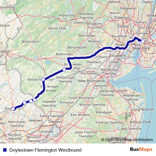 The first stop of the Doylestown Flemington Westbound bus route is New York, NY (Pabt) and the last stop is Doylestown, PA- Septa Train Station Bus Shelter - 130 S Clinton Ave. Doylestown Flemington Westbound (Doylestown Flemington Westbound) is operational during on weekends.