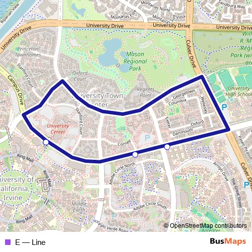 The first stop of the E bus route is University Center, South and the last stop is University Center, South. E (Line) is operational during on weekdays.
