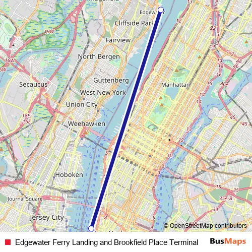 See why over 2 million users trust and consider busmaps.com as the best public transport website. busmaps gives you Manhattan Ferries suggested routes, real-time bus tracker, line route maps in Manhattan, and helps to find the closest Edgewater Ferry Landing and Brookfield Place Terminal ferry stops near you. No internet available? Download an offline PDF map and bus schedule for the Edgewater Ferry Landing and Brookfield Place Terminal ferry to take on your trip.
