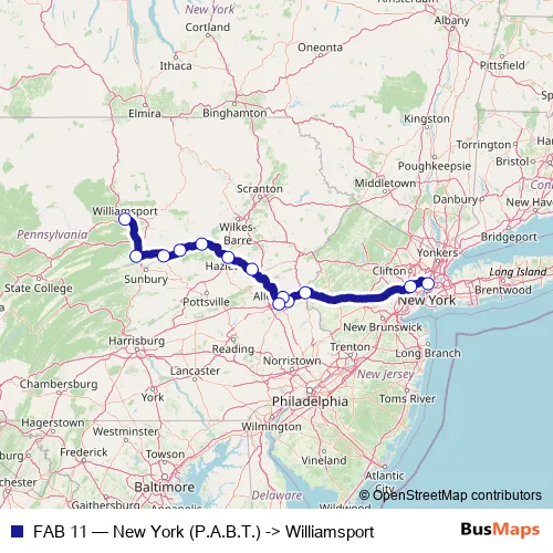 The first stop of the FAB 11 bus route is New York (P.A.B.T.) and the last stop is Williamsport. FAB 11 (New York (P.A.B.T.) -> Williamsport) is operational during everyday.