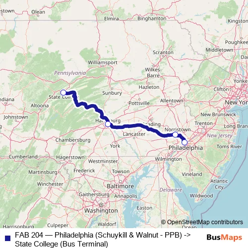 Bus FAB 204 - Philadelphia (Schuykill & Walnut - PPB) -> State College (Bus Terminal) in Harrisburg: Stops & Timetable