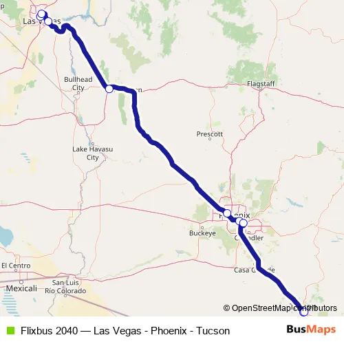 The first stop of the Flixbus 2040 bus route is Las Vegas Strip (Las Vegas Blvd) and the last stop is Tucson (6th Street Garage - University of Arizona, Tucson). Flixbus 2040 (Las Vegas - Phoenix - Tucson) is operational during everyday.