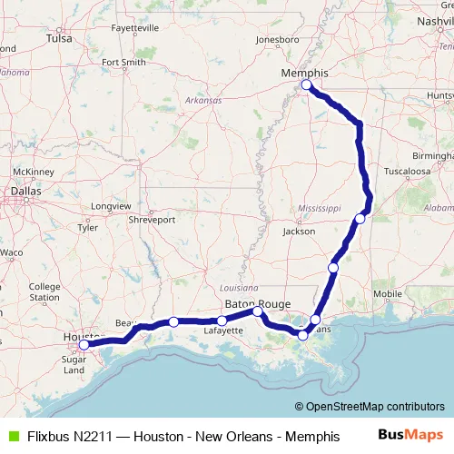 Click here to view the nearest Flixbus N2211 - Houston - New Orleans - Memphis bus stop.