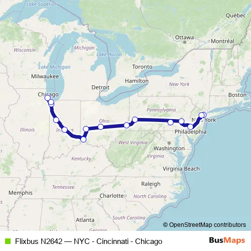 Click here to view the nearest Flixbus N2642 - NYC - Cincinnati - Chicago bus stop.