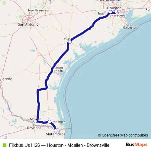 The first stop of the Flixbus Us1126 bus route is Matamoros(Hotel Los Lirios) and the last stop is Houston Bus Station (Greyhound). Flixbus Us1126 (Houston - Mcallen - Brownsville) is operational during everyday.