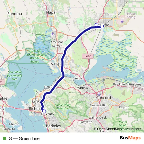 The first stop of the G bus route is El Cerrito del Norte Station (Stop C3) and the last stop is Fairfield Transportation Center. G (Green Line) is operational during on weekdays.