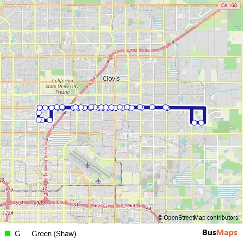 The first stop of the G bus route is Shaw Ave & Cedar Ave Eb and the last stop is Shaw Ave & Cedar Ave Eb. G (Green (Shaw)) is operational during everyday.