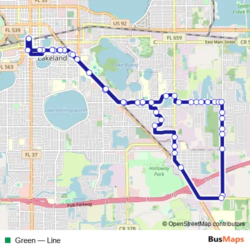 The first stop of the Green bus route is Lakeland Downtown Terminal and the last stop is Lakeland Downtown Terminal. Green (Line) is operational during everyday.