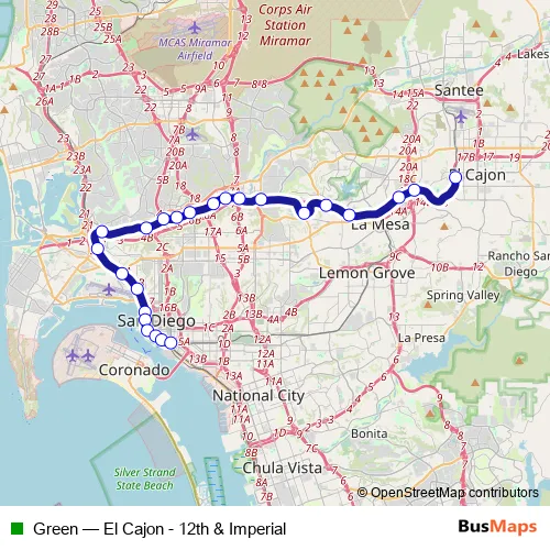 See why over 2 million users trust and consider busmaps.com as the best public transport website. busmaps gives you San Diego Trams suggested routes, real-time bus tracker, line route maps in San Diego, and helps to find the closest Green tram stops near you. No internet available? Download an offline PDF map and bus schedule for the Green tram to take on your trip.