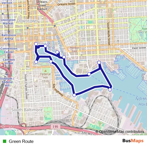 The first stop of the Green Route ferry route is Fell's Point and the last stop is Fell's Point. Green Route is operational during everyday.