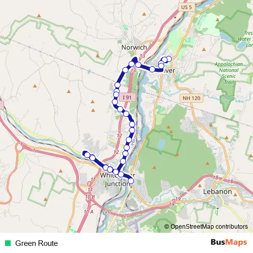 The first stop of the Green Route bus route is Vail Dms and the last stop is West Lebanon. Green Route is operational during everyday.