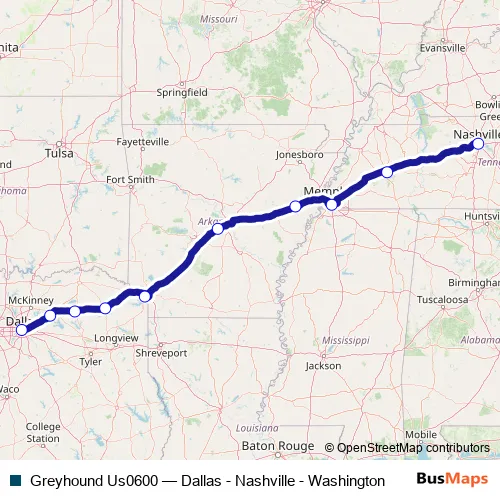 The first stop of the Greyhound Us0600 bus route is Dallas Bus Station and the last stop is Nashville Bus Station. Greyhound Us0600 (Dallas - Nashville - Washington) is operational during everyday.