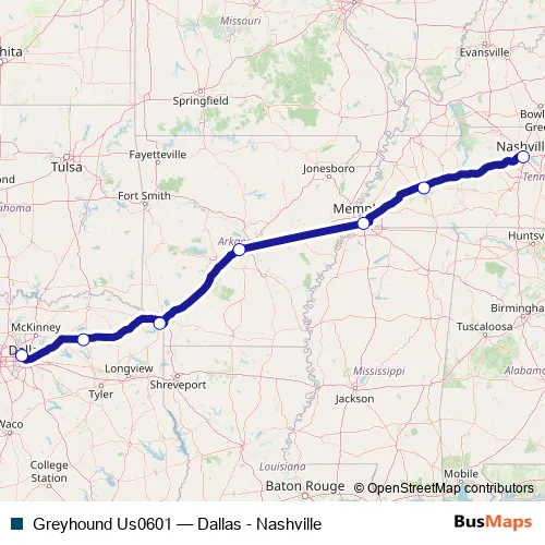 The first stop of the Greyhound Us0601 bus route is Dallas Bus Station and the last stop is Nashville Bus Station. Greyhound Us0601 (Dallas - Nashville) is operational during everyday.