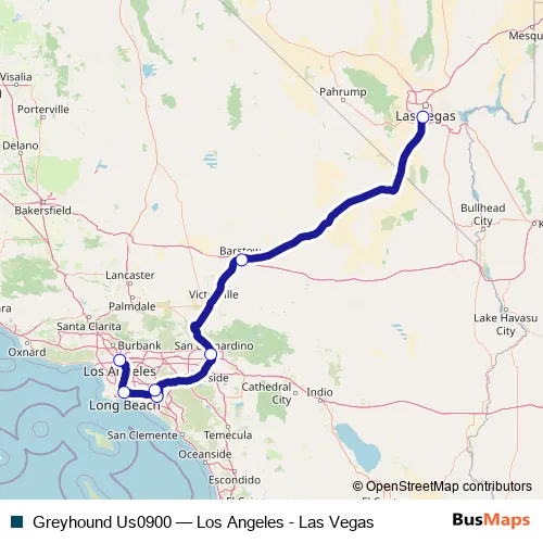 The first stop of the Greyhound Us0900 bus route is Las Vegas Busterminal and the last stop is Los Angeles Union Station. Greyhound Us0900 (Los Angeles - Las Vegas) is operational during everyday.
