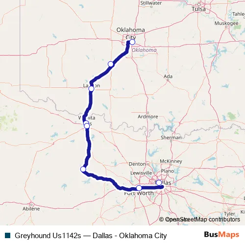The first stop of the Greyhound Us1142s bus route is Oklahoma City Bus Station and the last stop is Dallas Bus Station. Greyhound Us1142s (Dallas - Oklahoma City) is operational during everyday.