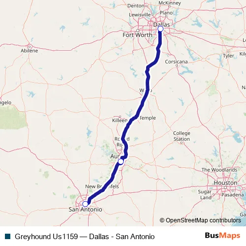 The first stop of the Greyhound Us1159 bus route is Dallas Bus Station and the last stop is San Antonio Bus Station. Greyhound Us1159 (Dallas - San Antonio) is operational during everyday.