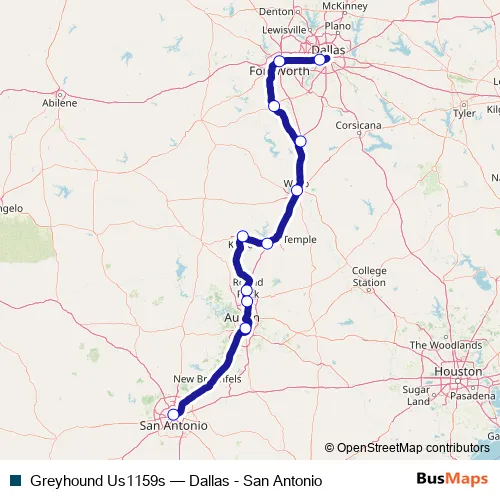 The first stop of the Greyhound Us1159s bus route is Dallas Bus Station and the last stop is San Antonio Bus Station. Greyhound Us1159s (Dallas - San Antonio) is operational during everyday.