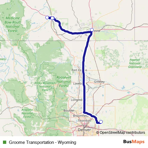 The first stop of the Groome Transportation - Wyoming bus route is Laramie Regional Airport and the last stop is Denver International Airport Pickups. Groome Transportation - Wyoming (Groome Transportation - Wyoming) is operational during everyday.