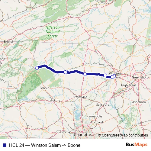 The first stop of the HCL 24 bus route is Winston Salem and the last stop is Boone. HCL 24 (Winston Salem -> Boone) is operational during everyday.