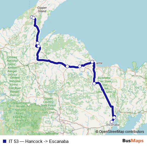 The first stop of the IT 53 bus route is Hancock and the last stop is Escanaba (Delta Area Transit). IT 53 (Hancock -> Escanaba) is operational during everyday.
