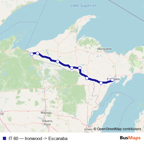The first stop of the IT 60 bus route is Ironwood (Gogebic Transit) and the last stop is Escanaba (Delta Area Transit). IT 60 (Ironwood -> Escanaba) is operational during everyday.