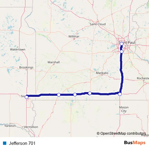 The first stop of the Jefferson 701 bus route is Minneapolis and the last stop is Sioux Falls. Jefferson 701 is operational during everyday.