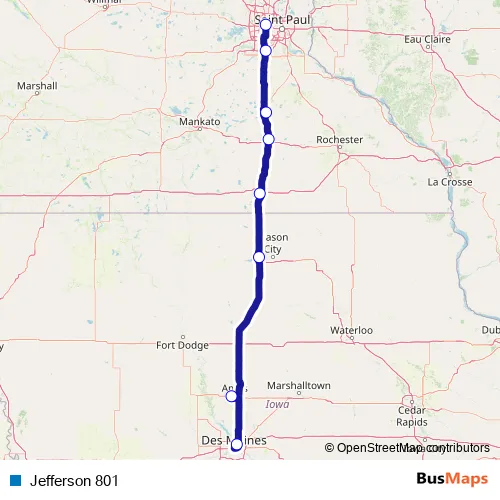 The first stop of the Jefferson 801 bus route is Minneapolis and the last stop is Des Moines. Jefferson 801 is operational during everyday.