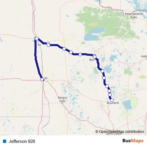 The first stop of the Jefferson 928 bus route is Fargo and the last stop is Brainerd. Jefferson 928 is operational during everyday.