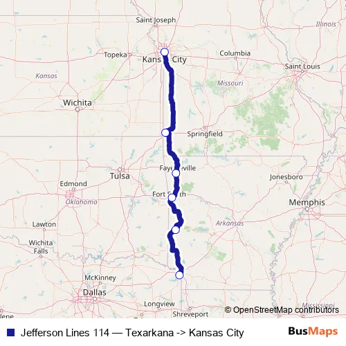 The first stop of the Jefferson Lines 114 bus route is Texarkana and the last stop is Kansas City. Jefferson Lines 114 (Texarkana -> Kansas City) is operational during everyday.