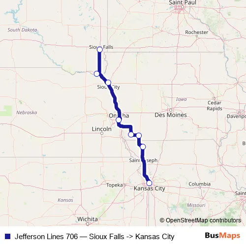 Click here to view the nearest Jefferson Lines 706 - Sioux Falls -> Kansas City bus stop.