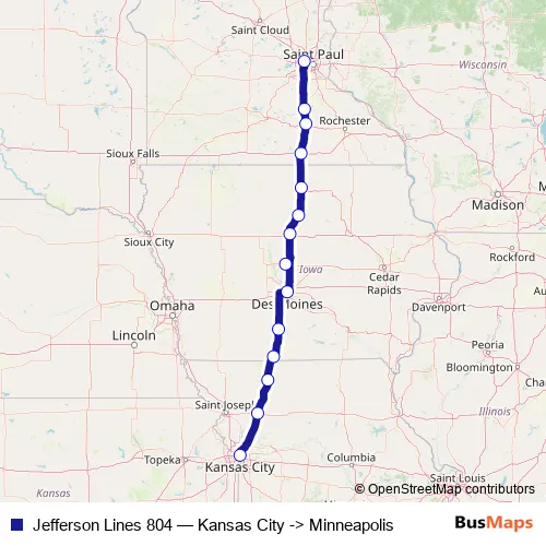The first stop of the Jefferson Lines 804 bus route is Kansas City and the last stop is Minneapolis (Bus Station). Jefferson Lines 804 (Kansas City -> Minneapolis) is operational during everyday.