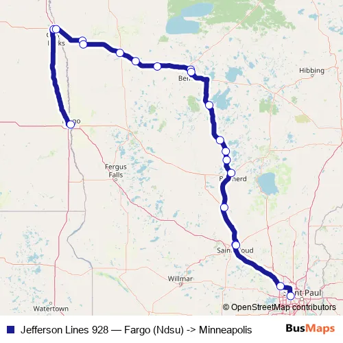 The first stop of the Jefferson Lines 928 bus route is Fargo (Ndsu) and the last stop is Minneapolis (Bus Station). Jefferson Lines 928 (Fargo (Ndsu) -> Minneapolis) is operational during everyday.
