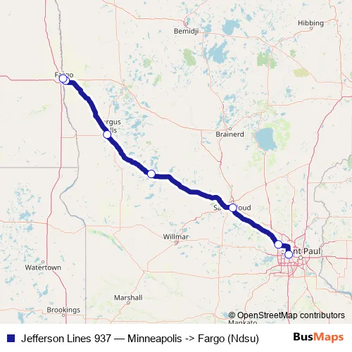 The first stop of the Jefferson Lines 937 bus route is Minneapolis (Bus Station) and the last stop is Fargo (Ndsu). Jefferson Lines 937 (Minneapolis -> Fargo (Ndsu)) is operational during everyday.