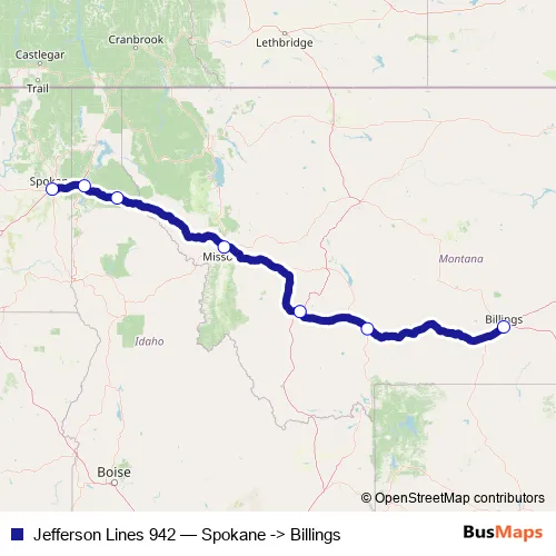 The first stop of the Jefferson Lines 942 bus route is Spokane and the last stop is Billings. Jefferson Lines 942 (Spokane -> Billings) is operational during everyday.