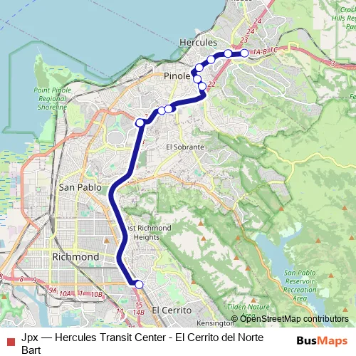 The first stop of the Jpx bus route is El Cerrito Del Norte Bart and the last stop is Hercules Transit Center. Jpx (Hercules Transit Center - El Cerrito del Norte Bart) is operational during on weekdays.