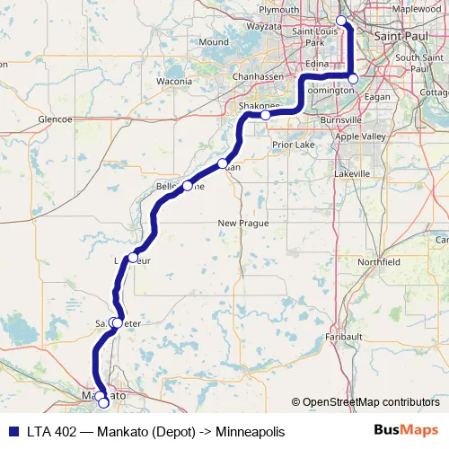 The first stop of the LTA 402 bus route is Mankato (Depot) and the last stop is Minneapolis (Bus Station). LTA 402 (Mankato (Depot) -> Minneapolis) is operational during everyday.