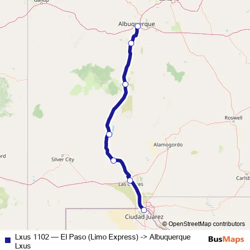 The first stop of the Lxus 1102 bus route is El Paso (Limo Express) and the last stop is Albuquerque. Lxus 1102 (El Paso (Limo Express) -> Albuquerque Lxus) is operational during everyday.