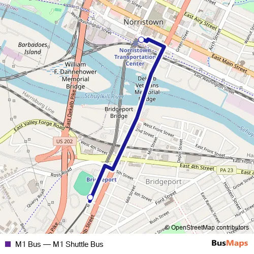The first stop of the M1 Bus bus route is Merion St at 8th (Bridgeport Shuttle Stop) and the last stop is Norristown Transit Center. M1 Bus (M1 Shuttle Bus) is operational during everyday.