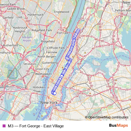The first stop of the M3 bus route is Saint Nicholas AV/W 192 St and the last stop is 4 AV/E 9 St. M3 (Fort George - East Village) is operational during everyday.