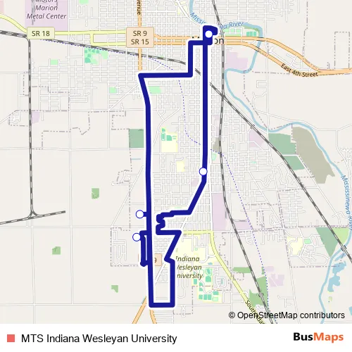 The first stop of the MTS Indiana Wesleyan University bus route is Bus Terminal and the last stop is Bus Terminal. MTS Indiana Wesleyan University (MTS Indiana Wesleyan University) is operational during on weekdays.